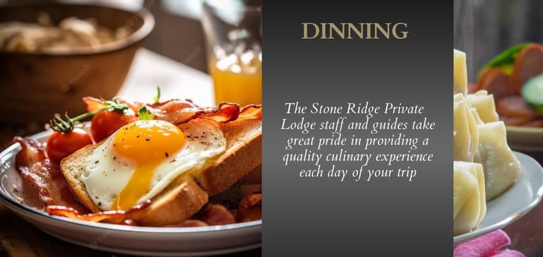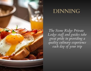 The Stone Ridge Private Lodge staff and guides take great pride in providing a quality culinary experience each day of your trip. Each day, breakfast will be served in the main lodge and typically consists of oatmeal or porridge, bacon, eggs, coffee, and tea. Lunch will be served on the river each day including sandwiches, cold cuts and a variety of different snacks to keep you going on the water. Each evening, dinner will be served family-style and is a staple meal each evening, consisting of soups, a variety of different meats and plenty of sides and vegetable dishes.